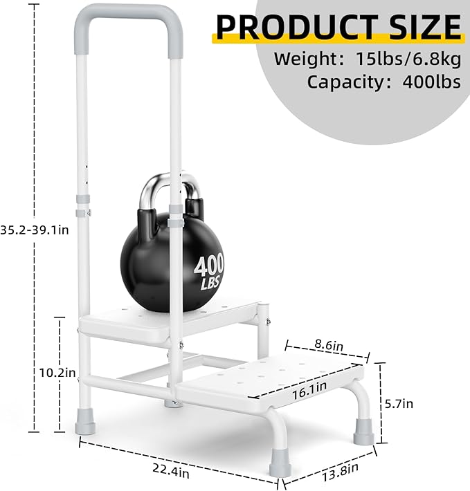 - [Stability and Safety]: HOMIQUEEN step stool with handle features a wider, thicker platform (8.6''W), with 6 robust carbon steel support tubes under the platform, which ensure the step stool is more sturdy and stable. Included are 4 anti-tip fixing buckle and reusable tie wraps, fixed the step stool to the bedside, strategically placed to prevent tipping over