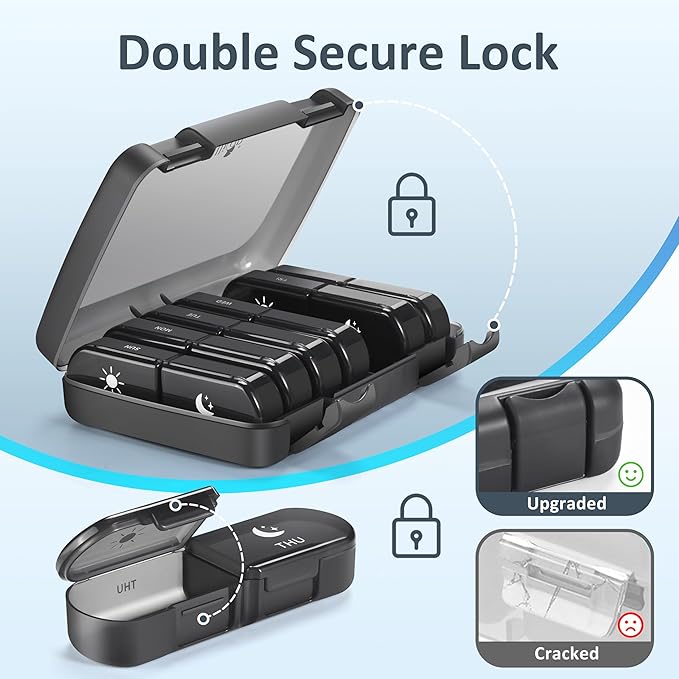 - 【Double Secure Lock】Once locked, the travel containers securely closed. Safeguarding the pills, the pill pockets prevents concerns about pets or children accidentally knocking over the supplement organizer