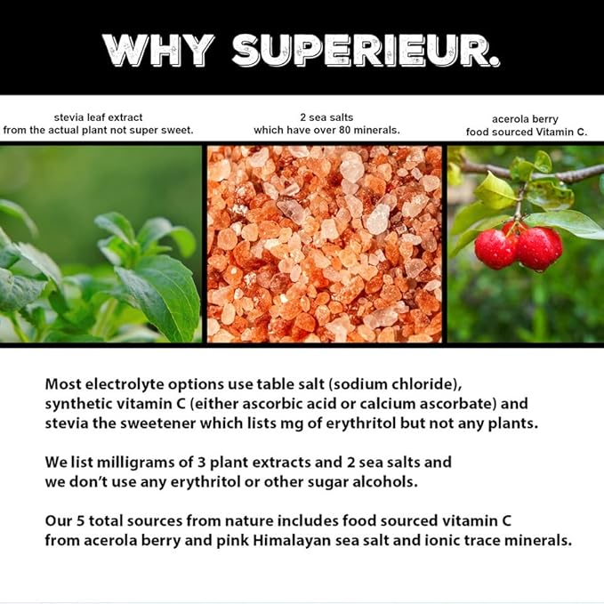 - FARM NOT PHARM: At Superieur Electrolytes, we do everything ourselves, eliminating 3rd party formulators, middlemen, and mass distributors. Our grassroots values empower us to deliver you an electrolyte drink with the best taste, ingredients, and price.