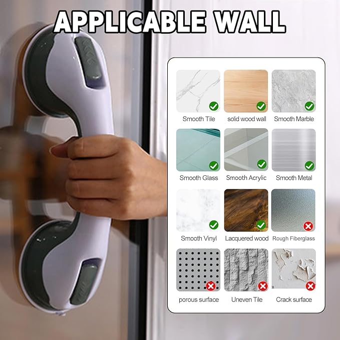 - Please pay attention that the suction grab bars for shower ONLY sticks on smooth and non-porous AIRTIGHT walls which are NOT air-permeable like metal, glass, tile, marble, stainless steel and acrylic but does NOT apply on uneven tile, unfinished marble, wallpaper, dry wall, porous wall, etc.