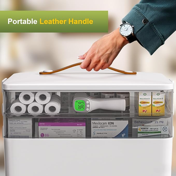 JOYBOS 3-Tier Medicine Storage Box Cabinet, Empty First Aid Kit Portable Medical Supply Organizer with Leather Handle for Home 3-Tier Medicine Storage Box