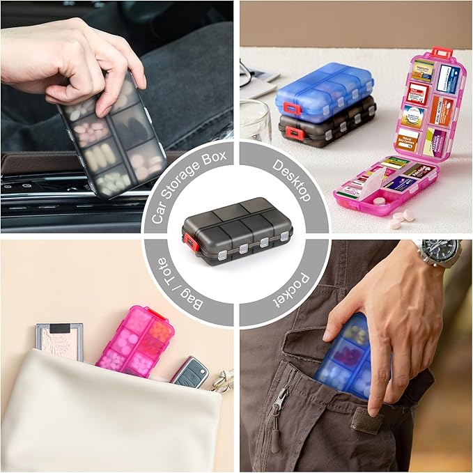 - FOLDING DESIGN & SAVES SPACE - Compact design makes it easy to carry. You can easily fit them in your pocket, tote bag, suitcase, car storage compartment, office desk or drawer, etc., Make it be a palm pharmacy, always accompanied by you within reach! A perfect personal or family, work, out door or travel essentials pill organizer dispenser.