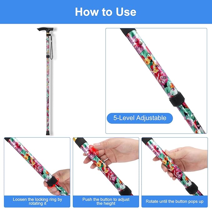 supregear Folding Cane, 5-Level Adjustable Height Walking Stick Lightweight Collapsible Portable Travel Cane with Wrist Strap and T Handle for Elderly Disabled Men Women