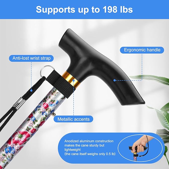 supregear Folding Cane, 5-Level Adjustable Height Walking Stick Lightweight Collapsible Portable Travel Cane with Wrist Strap and T Handle for Elderly Disabled Men Women