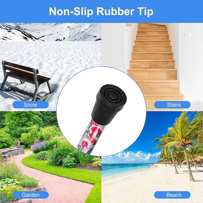 - The tip is made of sturdy TPR anti-slip material, providing great traction and stability; it could be replaced to other types of cane tips to meet various requirements