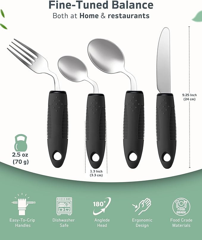 - MULTI-PURPOSE ADAPTIVE SILVERWARE: Ideal as utensils for Parkinson's patients, eating utensils for disabled people, and silverware for arthritic hands. This adaptive flatware set caters to various conditions, including ALS and stroke, enhancing independence during meals.