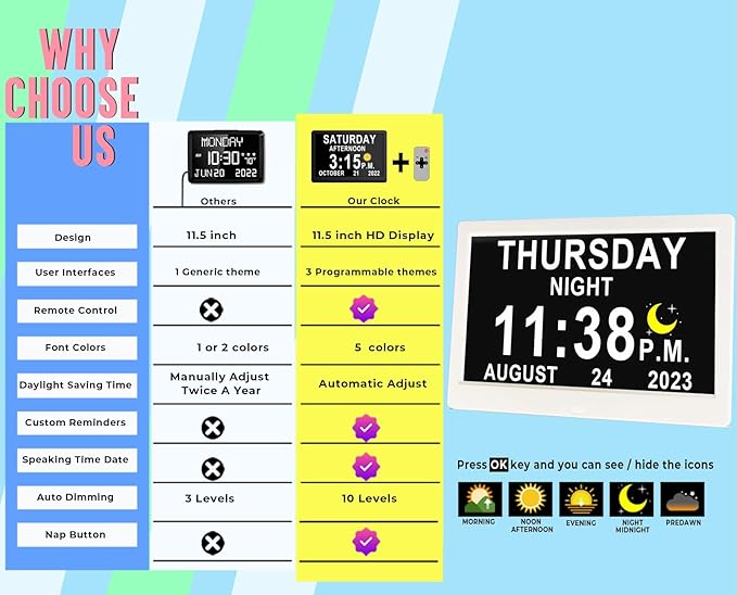 - ๐๐๐๐ผ ๐๐ฆ๐ง ๐๐ฑ๐ท๐๐๐๐บ๐ฒ๐ป๐ & ๐ณ ๐ง๐ถ๐บ๐ฒ๐ฟ ๐๐๐ฐ๐น๐ฒ๐: no need to manually spring forward or fall back, MASSII clock has automatic DST adjustment in March and November. 7 cycles include MONRNING, NOON,AFTERNOON, EVENING, NIGHT, MIDNIGHT, PREDAWN. Custom time of morning brightening and night dimming as needed