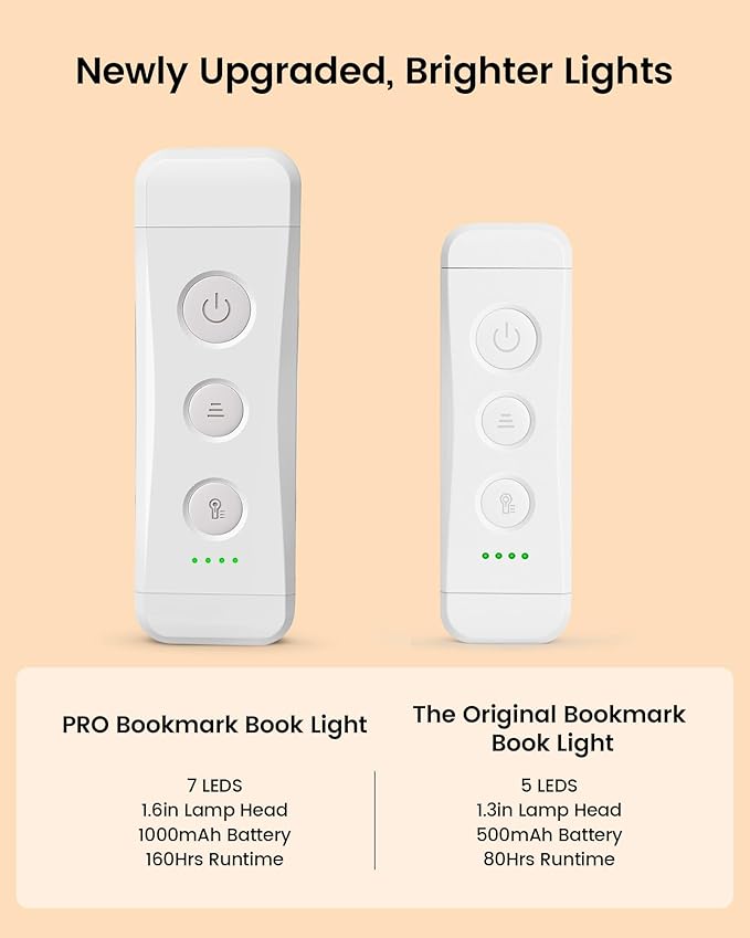 - [5 Brightness Adjustable] This reading light has 5 brightness levels available, you can choose the most suitable level for your eyes. You can set your favorite brightness as default with the book lights for reading at night. Plus, there are 7 LED beads scientifically installed so the light can be evenly distributed on reading pages. It is bright enough to illuminate the full pages, while it is dim enough not to disturb others nearby. No flickering, nor harsh light.