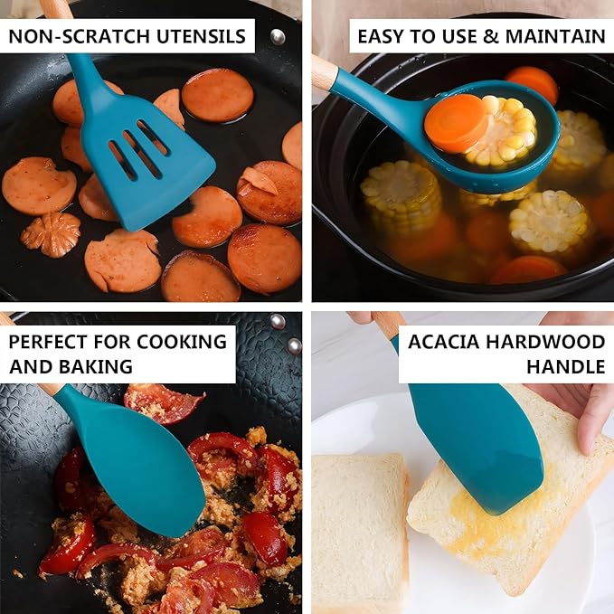- 【FOOD GRADE SILICONE & WOODEN HANDEL】Food-grade silicone, BPA-FREE. This silicone cooking utensil does not react with food or beverages, or produce any hazardous fumes, allowing for healthy cooking while protecting your coated cookware. Each utensils set with durable wooden handle, it feels comfortable and strong to hold, prevents heat transfer, protecting your hands from being scald and allows you to enjoy cooking for long time without feeling tired.