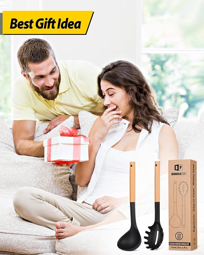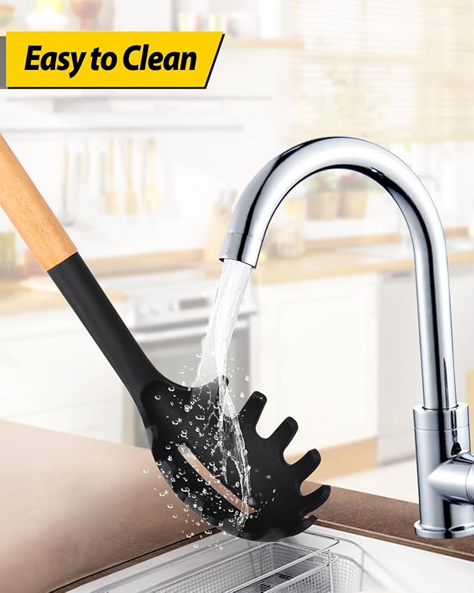 Silicone Pasta Fork and Ladle Spoon Set with Wooden Handle, Heat Resistant Non Stick Kitchen Utensils for Cooking, Stirring, Serving Spaghetti, Soup, Sauce(BLACK)