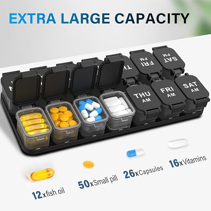Extra Large Weekly Pill Organizer - Waterproof Pill Box 2 Times a Day, 7 Day Am Pm Medicine Pill Organizer for Supplements, Big Daily Pill Case Holder with Detachable Container for Vitamin/Fish Oil