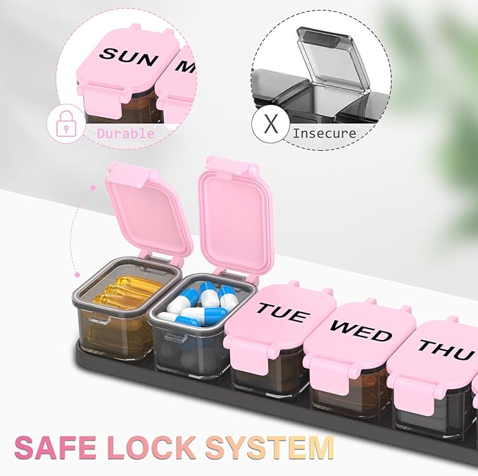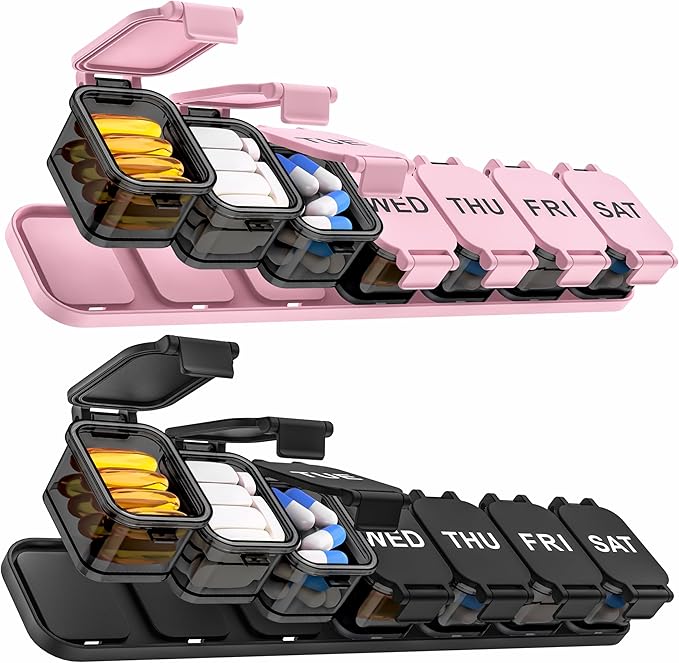 - 【Clearly Printed Labels】Clearly printed labels ensure that you always take them as planned, allowing you to easily manage your weekly pills. And the shell color is designed in black, which has a light-shielding effect, which is very suitable for protecting light-sensitive drugs.