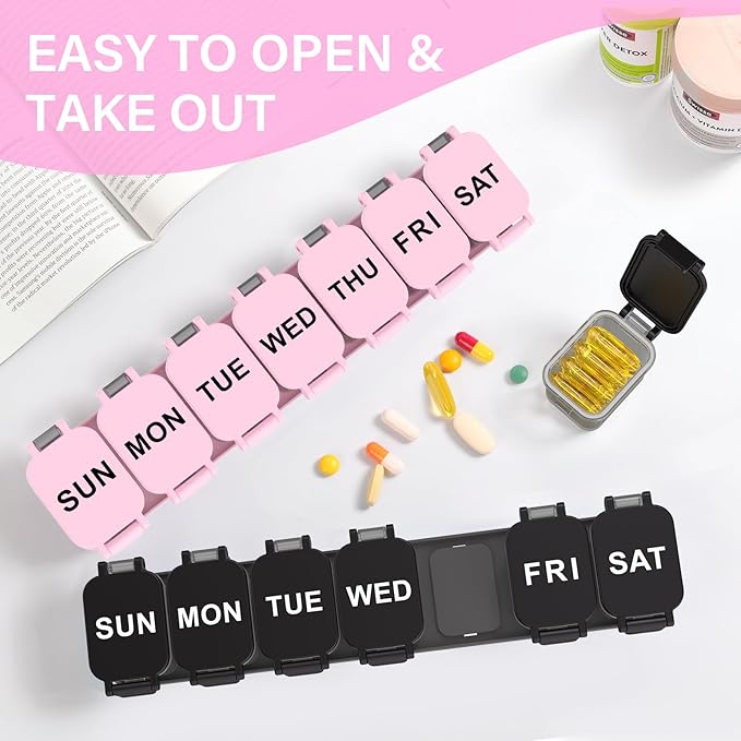 - 【Removable Compartments】This pill box features detachable daily compartments that can be used individually or fixed into the tray—you can take one day pill box in your bag and don't need to worry about pills dump out. Each compartment measures 1.3x 1.77 x 1.26 inches, making it ideal for those with high daily medication needs.