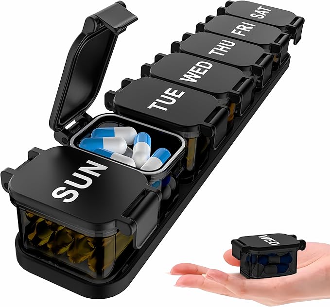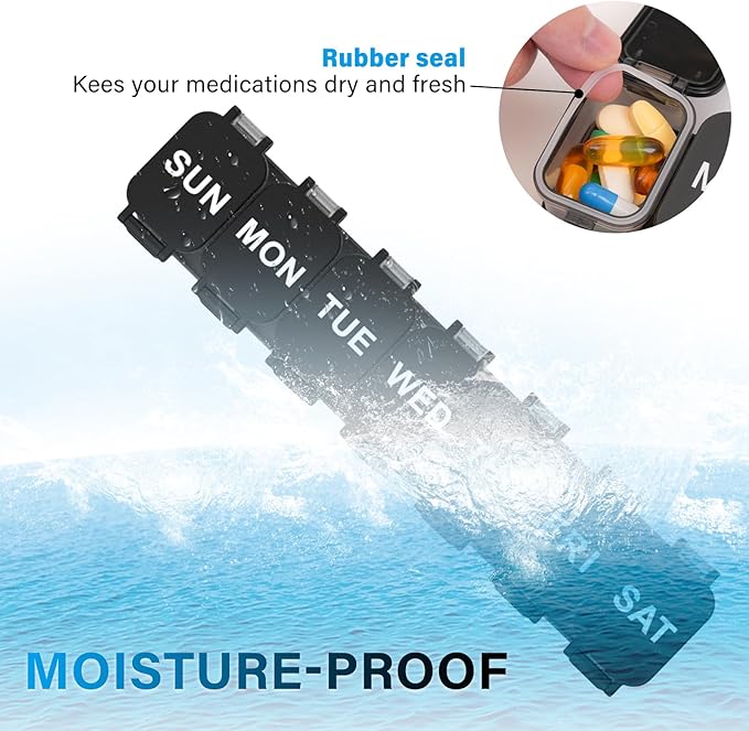 - 【Clearly Printed Labels】Clearly printed labels ensure that you always take them as planned, allowing you to easily manage your weekly pills. And the shell color is designed in black, which has a light-shielding effect, which is very suitable for protecting light-sensitive drugs.