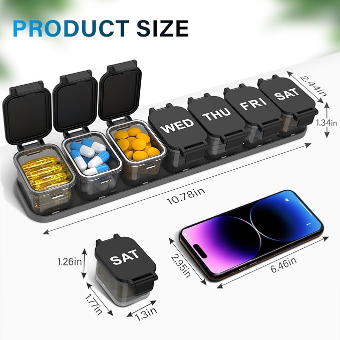 - 【Removable Compartments】This pill box features detachable daily compartments that can be used individually or fixed into the tray—you can take one day pill box in your bag and don't need to worry about pills dump out. Each compartment measures 1.3x 1.77 x 1.26 inches, making it ideal for those with high daily medication needs.