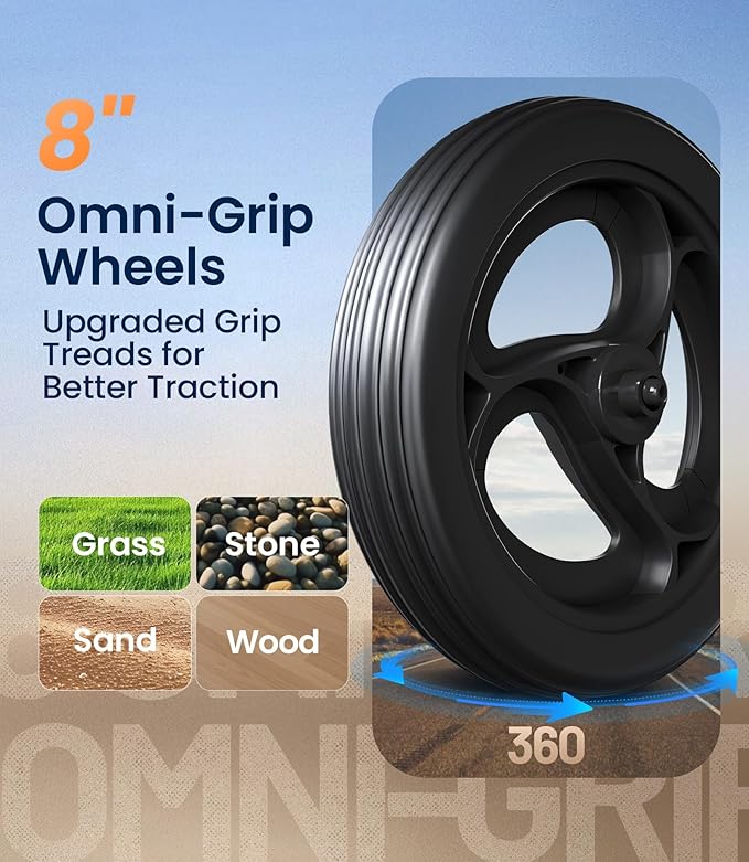 - 【8”Off Road Mastery】The 8" wheel diameter design of this Upright Walker significantly improves the ability to cross obstacles, easily dealing with gravel roads, potholes and other complex terrain; upgraded three-dimensional non-slip pattern tread in the rain, snow and slippery road surface still maintains excellent grip. With 360 ° flexible steering of the front wheel system, the narrow space can also be steered flexibly, the implementation of the more labor-saving.