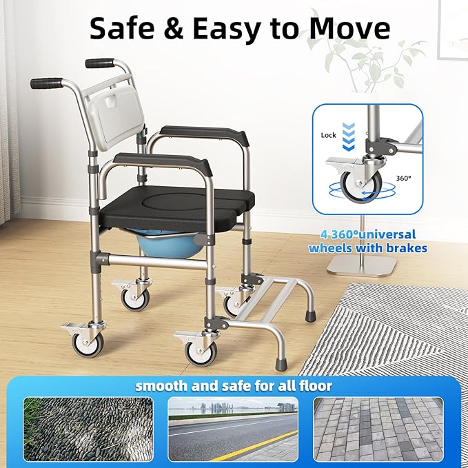 - MULTIFUNCTIONAL 4 IN 1 Design: Can be used as a shower chair, wheelchair, bedside commode and raised toilet, which would be a great helper in daily life for seniors, disabled, injured and pregnant women.