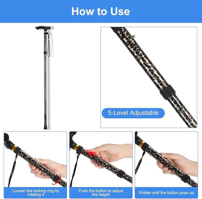 supregear Folding Cane, 5-Level Adjustable Height Walking Stick Lightweight Collapsible Portable Travel Cane with Wrist Strap and T Handle for Elderly Disabled Men Women