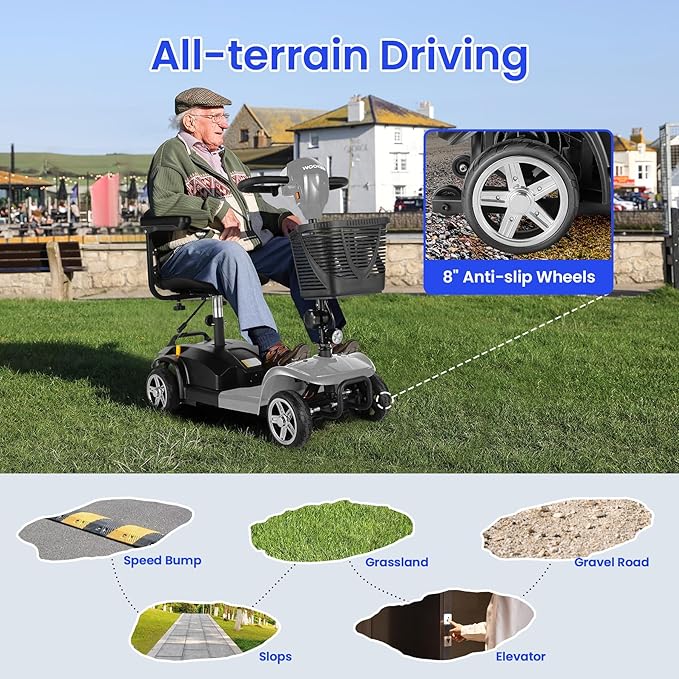- All-Tarrent Riding Mobility Scooter: The 4-wheel mobility scooter has a steel frame and a 250W strong brushless motor, with a capacity of up to 264 lbs. Its solid and durable 8" PU tires are flat-free, non-marking, and easy to grip on the ground, can easily conquer obstacles and navigate uneven terrain, including lawns, gravel roads, and speed bumps. The basket provides ample storage space for your travels and shopping.