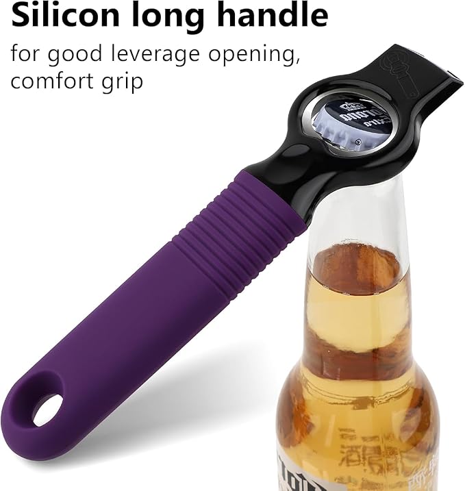 - ERGONOMICALLY DESIGNED HANDLE: 6.9inches long handle has good leverage to easily open bottles and tabbed can fast. Silicone material makes it fit the palm comfortably and providing an outstanding non-slip grip even with wet hand.