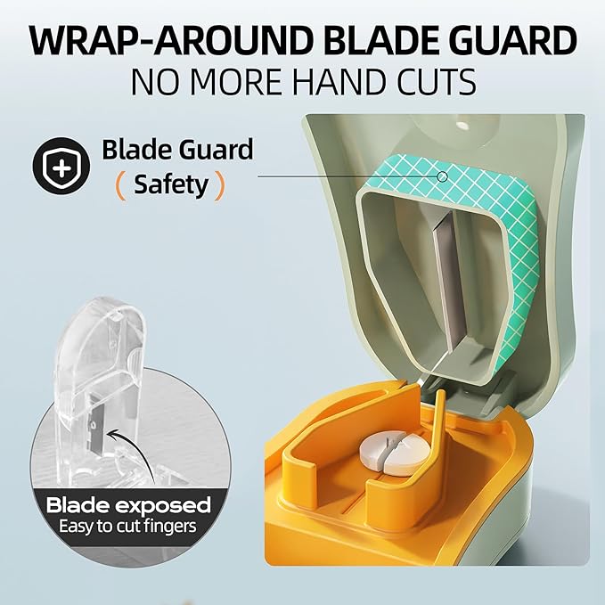 - 【Safety & Easy to Use】The wrap-around blade guard prevents cuts, and it’s easy to use: Just place the pill in the medicine cutter for pills 1/2, press the top evenly, and you can easily cut tablets/supplements into 1/2
