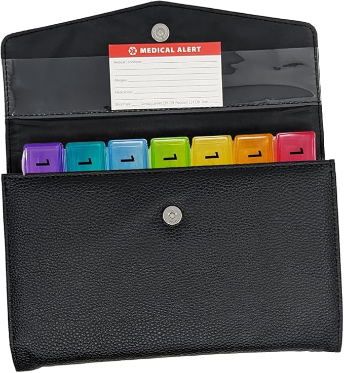 - Secure, Travel-Friendly Faux Leather Case – Durable, pebble grain textured wallet with a sleek magnetic closure keeps pill boxes safe and discreet on the go