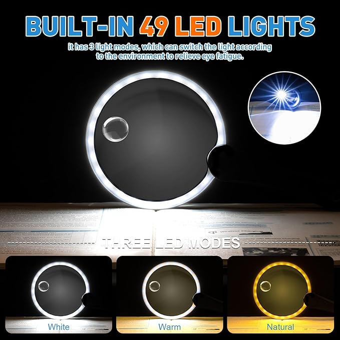 - Super Clear Vision : This magnifying glass for reading is equipped with 49 ultra-bright LEDs that provide three color lighting options to match different tasks. Its upgraded dimmer button prevents accidental touches and conserves power. (short-press to cycle modes; long-press for brightness control)