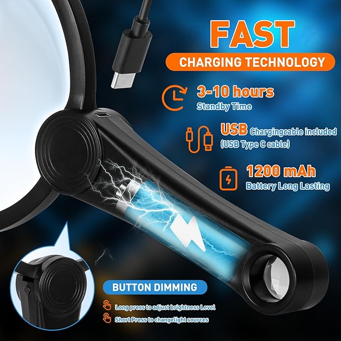 - Long-Lasting & Eco-Smart Power : This magnifier with light hands free features a built-in 1200 mAh rechargeable battery that supports rapid charging and provides extended, glare-free illumination. No need to constantly replace batteries, helping you save on long-term costs.