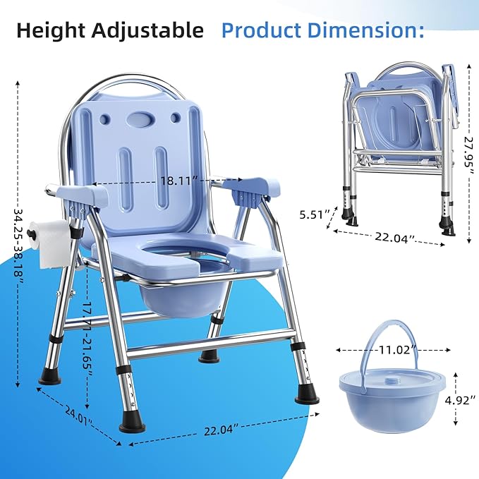 - FOLDABLE & SPACE-SAVING DESIGN: Our bedside commode chair features an innovative folding mechanism, allowing it to be easily collapsed and stored when not in use. Push the buckle downward, then secure it into the groove to keep the chair in the open position. Pull the buckle upward to fold the chair. Its compact design is perfect for small bathrooms or limited spaces, making it ideal for individuals with space constraints. The detachable commode bucket can be conveniently pulled out from the front for hassle-free cleaning.
