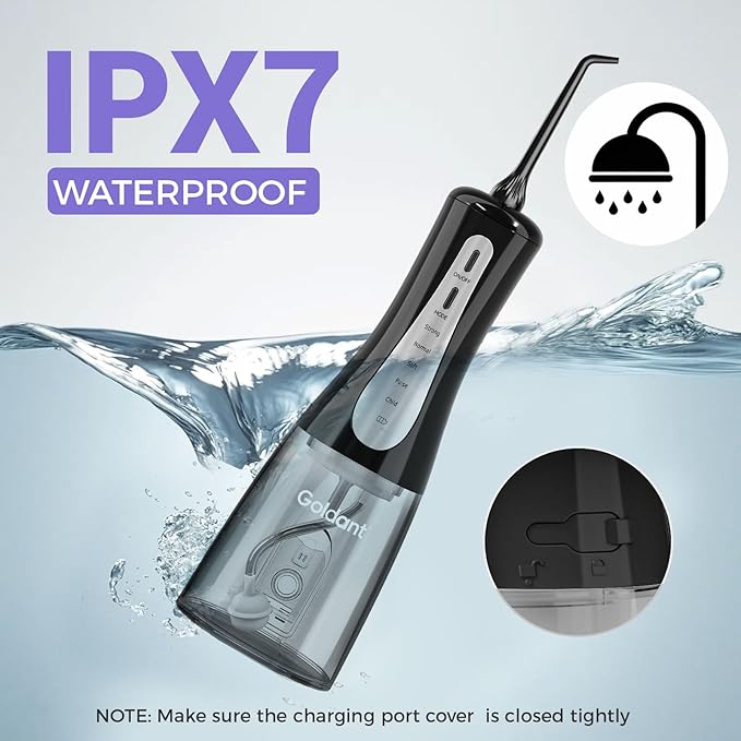 - 【Travel bag design and IPX7 waterproof】The rechargeable water flosser comes with a travel bag, is cordless and lightweight. Portable water flosser takes 3-hours full charge and lasts 30 days per charge, suitable for travel, outdoor activities and home use; With a IPX7 waterproof feature,water flosser cordless is safe to rinse under water and shower in bathroom when the charging port is securely covered