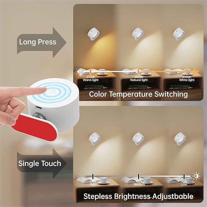 - 【Touch Control 3 Brightness Levels & 3 Color Temperature & ON/OFF】Dimmable wall lights Lightly touch button to adjust between low, medium and high 3 brightness and ON/OFF. Long press to adjust the 3 color temperature : 2700K(Warm White), 4000k(Natural White), 5700k(White Light).You can DIY the brightness and color temperature. Cordless LED wall sconces will help you remember the last mode and brightness that you used for more convenient to next time.