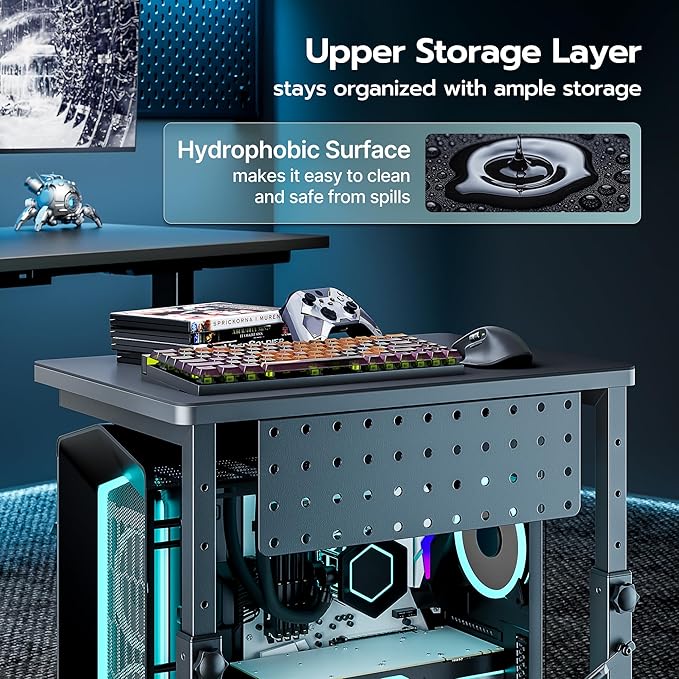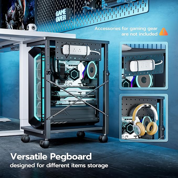 - 【Quick Setup & Multi-Scene Versatility】Setting up and using the computer tower stand is straightforward and hassle-free. Our 2-tier mobile PC stand features easy assembly with clear instructions and an installation video, making setup a breeze—no tech skills needed. Beyond holding your PC, this tower stand can serve as a mobile workstation, side table, or storage solution, making it a versatile addition to any space. Transition seamlessly among your gaming space, workspace, and living area