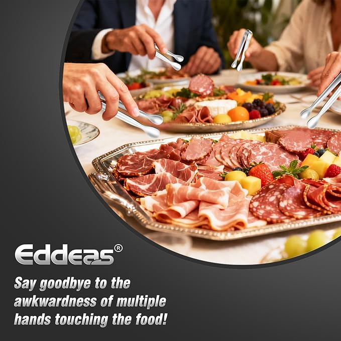 - Classic Silver 12-Piece Set - samll tongs for serving food. The high quality small serving tongs are made of food grade stainless steel for outstanding durability. Don't worry about rust and discoloration. These mini tongs are safe for food contact and long-term use! Smooth edges with no peaked edges for safe use and more comfortable touch.