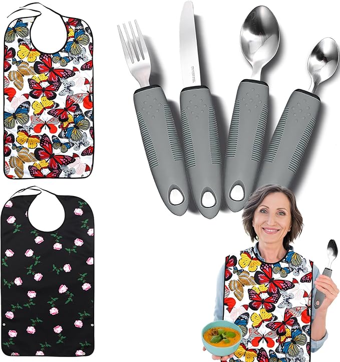 - Built to Last: The adaptive utensils for elderly includes a tablespoon, teaspoon, knife, and fork, made from high-quality rust-resistant stainless steel. The included bib is reusable and does not fade after multiple washes. A long-term solution for daily independence