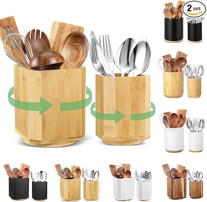 2 Pack Wooden Utensil Holder, 360°Rotating Kitchen Cooking Utensil Crock, Spoon Spatula Holder for Kitchen Counter, Farmhouse Countertop Organizer ()