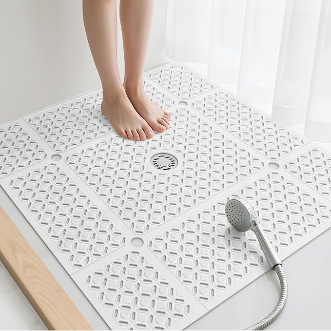 - SOFT TPE MATERIAL: Made from upgraded TPE, our shower floor mat non slip is stronger than rubber and softer than PVC shower mat, which is a great balance of sturdy and comfort. And it is easy to cut to fit your shower space. When not in use, the shower matt for iniside shower is also foldable for convenient storage