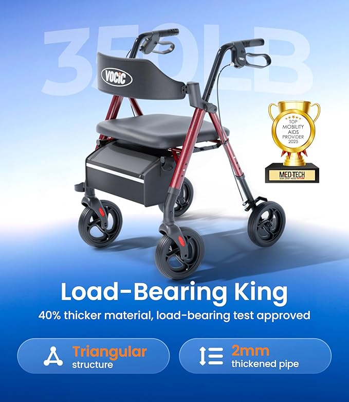 VOCIC Walkers for Seniors, Z21 Rollator Walker with Seat Supports 350lb, 8" Big Wheels for All Terrain, Ergonomic Arc Seat & 6" Ultra Backrest Foldable Walker, Dual Height Adjustment, Lightweight 2025