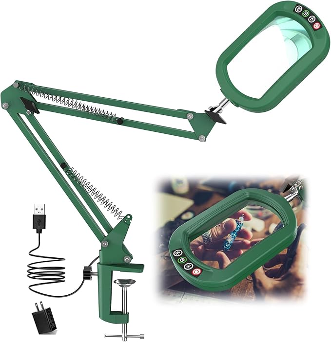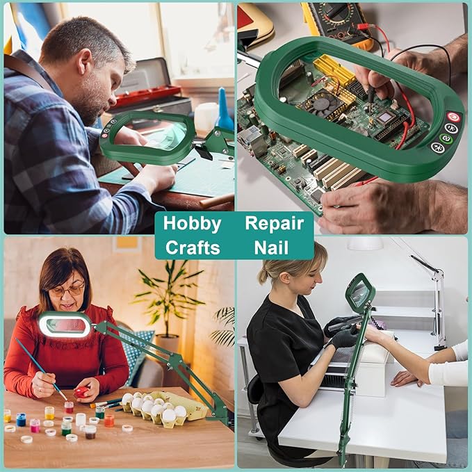 - Flexible Adjustment & Swing Arms: The magnifier is equipped with two linked metal swing arms, four springs, and three rotary knobs, providing maximum flexibility. Each arm extends up to 8.9", allowing precise positioning. The 360° rotating light head ensures illumination from any angle, while the locking knobs keep everything stable. Perfect for delicate tasks like crafting, painting, or repairing small electronics, it offers optimum lighting and adjustability.