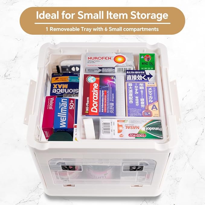 - Removable Inner Tray for First Aid Kit Organization. This plastic medicine organizer box includes a tray (9.65" x 7.2" x 1.34") for pills, ointments, bandages, and tools. Keeps your first aid kit box neat and ready for emergencies