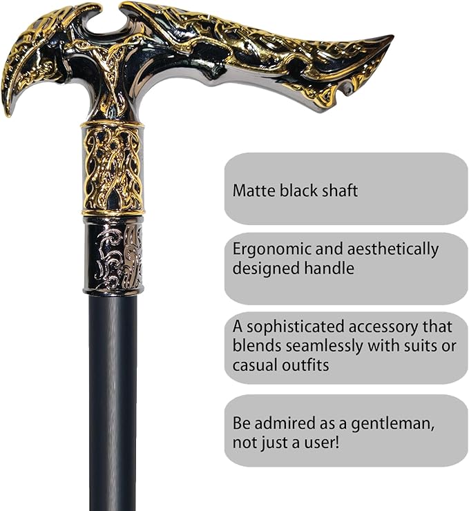 Walking Cane for Men & Women & Seniors - 36.5 Inch Heavy Duty 500+ lbs Capacity, Ergonomic Handle, Ornate & Decorative, Elegant Matte Black & Silver Metal Cane with Goth & Gothic Aesthetic