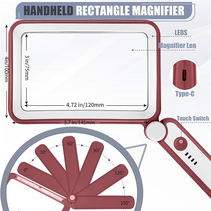 - Broader Visual Areas: Our magnifying glass feature rectangular lenses that are easier to read and improve the edge distortion common with round lenses. The improved and enlarged 4.7" x 2.95" lens provides a larger viewing area. Whether you're reading a book, looking at a map, or working on a detailed project, your reading experience will be smoother and more enjoyable.