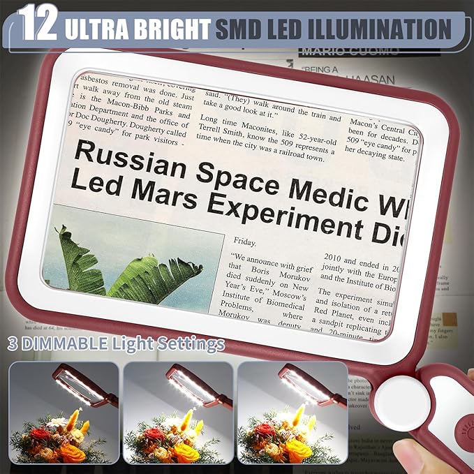 - Touch Switch & Adjustable Lighting: The full page magnifier has 12 super-bright LEDs. Easily illuminate your reading material. Simply touch the on/off switch on the magnifier handle to set the desired brightness easily. The LEDs provide bright, even light to ensure every detail is visible, reducing eye fatigue and improving the overall viewing experience. A perfect aid for seniors suffering from ageing eyes and macular degeneration.