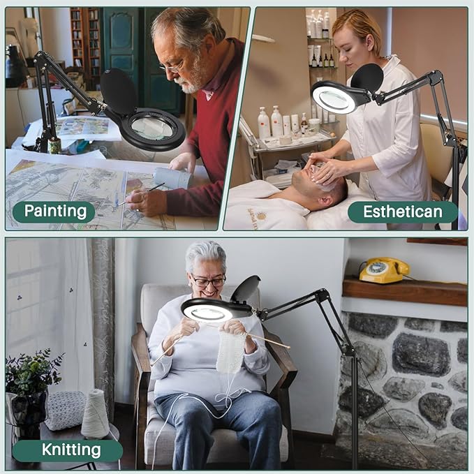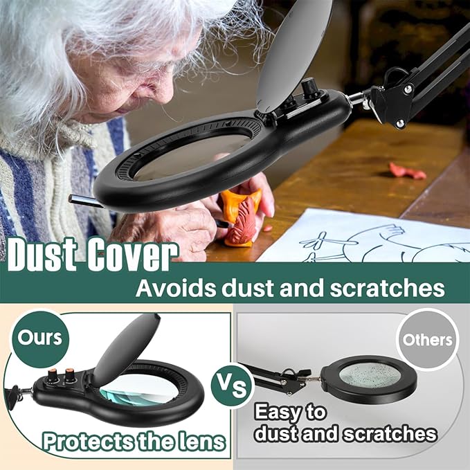 - Thoughtful dust cover design: The standing magnifying glass comes with a handy dust cover that effectively prevents dust from collecting on the lens, ensuring you always have a clear view of your detailed work, whether you're crafting, reading, or inspecting small components. What is more, with the dust cover on, the magnifying light can also be used as a floor lamp, providing versatile lighting options for your workspace