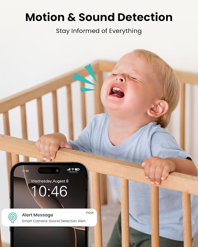 - 【Smart Motion Detection & Tracking & IR Night Vision】This home security camera features smart tracking and motion detection. It sends instant phone alerts for people, motion, or unusual sound, automatically saving a 6-second clip to the cloud for 24 hours. With clear IR night vision up to 33ft, you can remotely monitor baby’s room, even in total darkness.