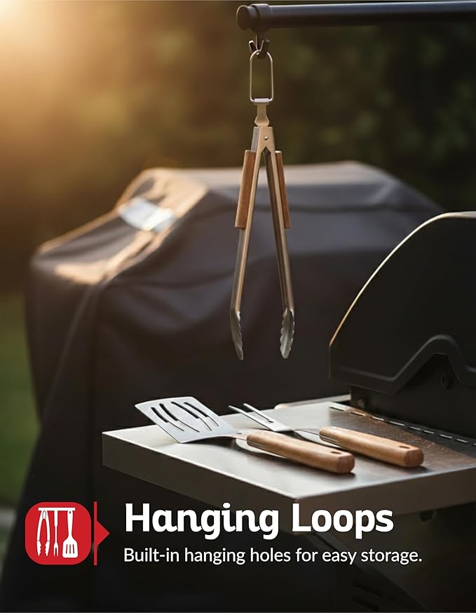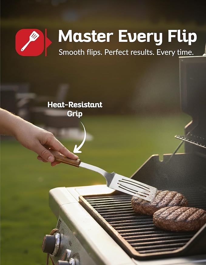 - Complete Grill Accessories Kit - This BBQ accessories set stainless steel includes the three grilling essentials: spatula, fork, and tongs. Perfect for flipping, lifting, or serving food, this outdoor cooking tools kit is ideal for backyard BBQ parties, camping trips, and tailgating events. Enjoy is designed for accurate flipping and serving. whether you’re cooking burgers, hotdogs, or delicate vegetables.