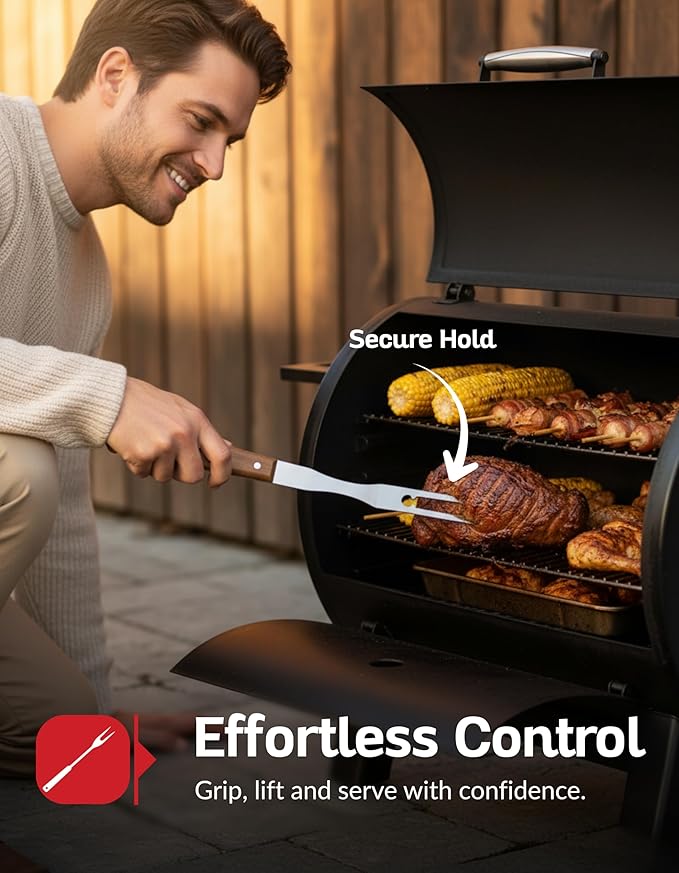 - Ergonomic Handles for Comfort & Safety - Our professional BBQ spatula, fork & tongs are designed with heat-resistant, non-slip handles for comfort and safety. The ergonomic design prevents hand fatigue, while the extra-long handles keep you safe from flames. These grill utensils provide a comfortable grip suitable for all skill levels, making every barbecue session effortless.
