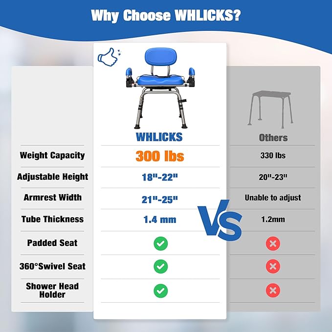 - π¦ππππ§π¬ & π¦π§ππππππ§π¬: Built to support up to 300 lbs, WHLICKS heavy duty shower chair features a reinforced 1.4mm aircraft-grade aluminum alloy frame for exceptional durability. Non-slip rubber foot pads provide a secure grip, ensuring the chair stays firmly in place even on wet surfaces. Enjoy a safe and stable showering experience with every use.