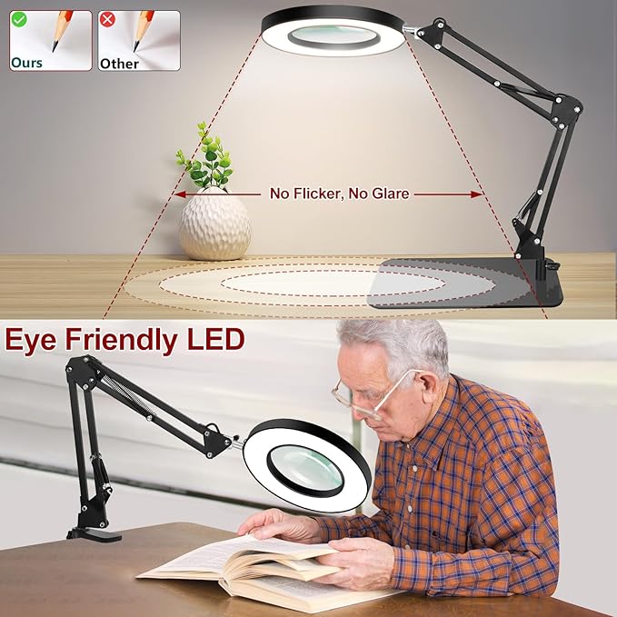 - Eye-Friendly Lighting: This desk magnifying lights adopts the latest generation of high-quality LED beads with professional design, no flicker, no blue light, effectively protecting your vision. our magnifying lamp with 5 levels of color temperature adjustment and 10 levels of stepless lighting control.
