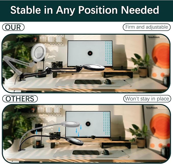 - Heavy Base For Stable: Our magnifying light features a sturdy rectangular large base, ensuring it remains firmly planted without any risk of sliding. With its flexible swing arms, adjusting the angle to perfection is a breeze. The high-quality joint springs and screw design effectively prevent sagging. Easily position the lamp without any bouncing back, allowing you to stay fully focused on intricate tasks, hobbies, miniatures painting, sewing.