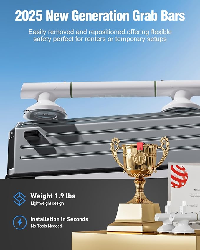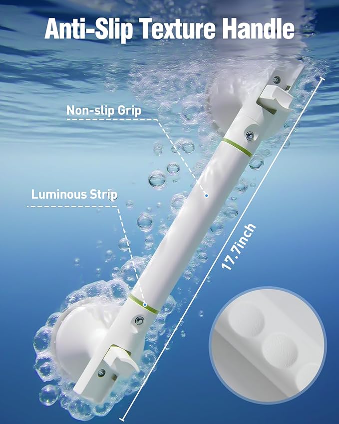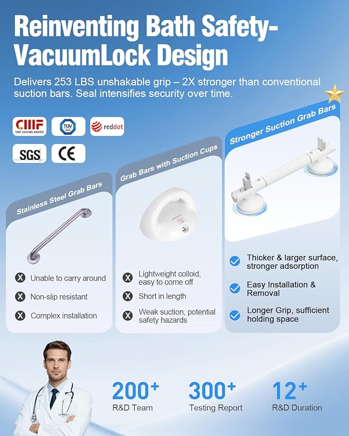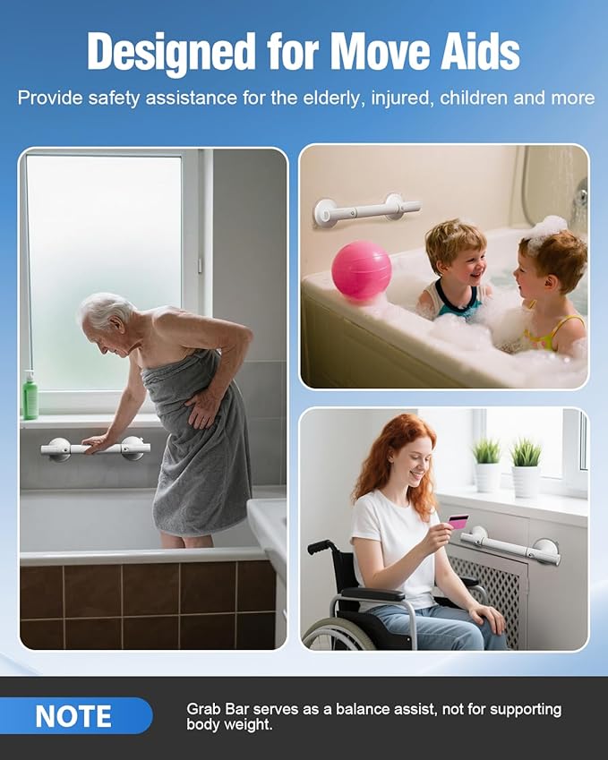 - Ultimate Security & Heavy-Duty Support for Seniors: Our upgraded, heavy-duty suction grab bars for shower instantly lock onto walls, offering reliable support for up to 253 LBS; This is an essential safety aid for those needing bathroom stability, whether recovering post-injury or seeking permanent bathing assistance; It delivers critical support and peace of mind to ensure a safer bathroom routine